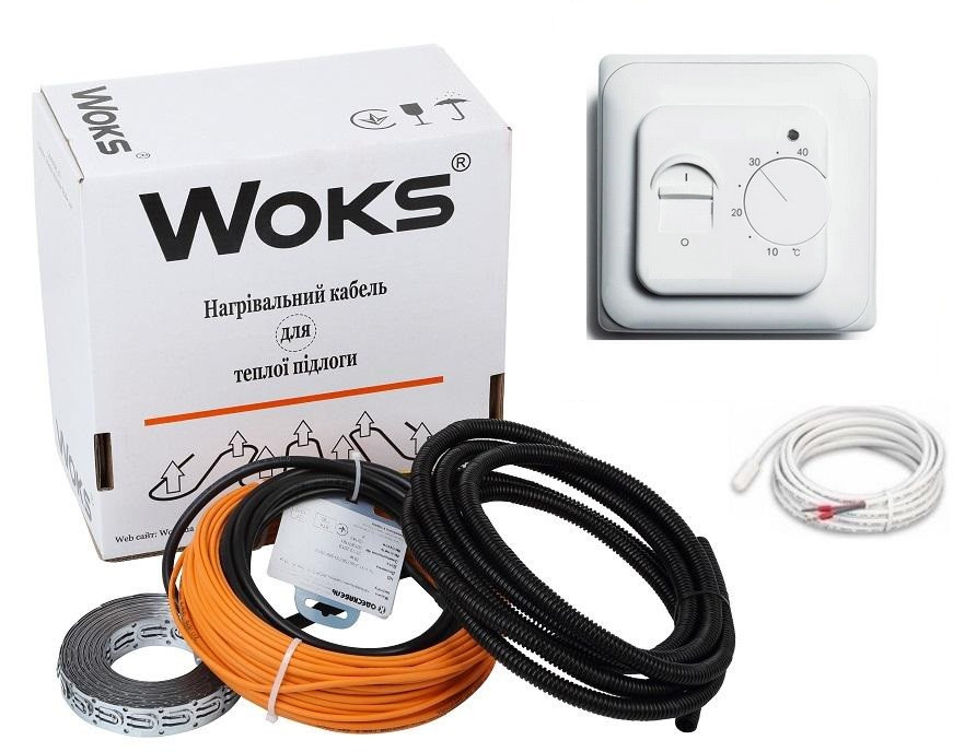 Тепла підлога Woks (Україна) 18 Вт/м тонкий двожильний нагрівальний кабель — продукція високої якості, використовується для облаштування систем електроопалення. Виготовляється на території України (Одеський кабельний завод). Кабель укладається в плитковий клей. В залежності від кроку укладання, безпосередньо визначається потужність обігріву. Крок визначається цілями, які ставляться перед системою опалення. Так, для підігріву підлоги з метою комфортного пересування по ній, достатньо кроку в 10 см. Але якщо завдання теплої підлоги послужити основним джерелом опалення приміщення, тоді крок зменшується. Діаметр кабелю становить 3,5 мм. Для поліпшення енергоефективності, обладнується захисним екраном з фольги, виготовленої з алюмінію. Регулювання потрібного режиму температури здійснюється терморегулятором.