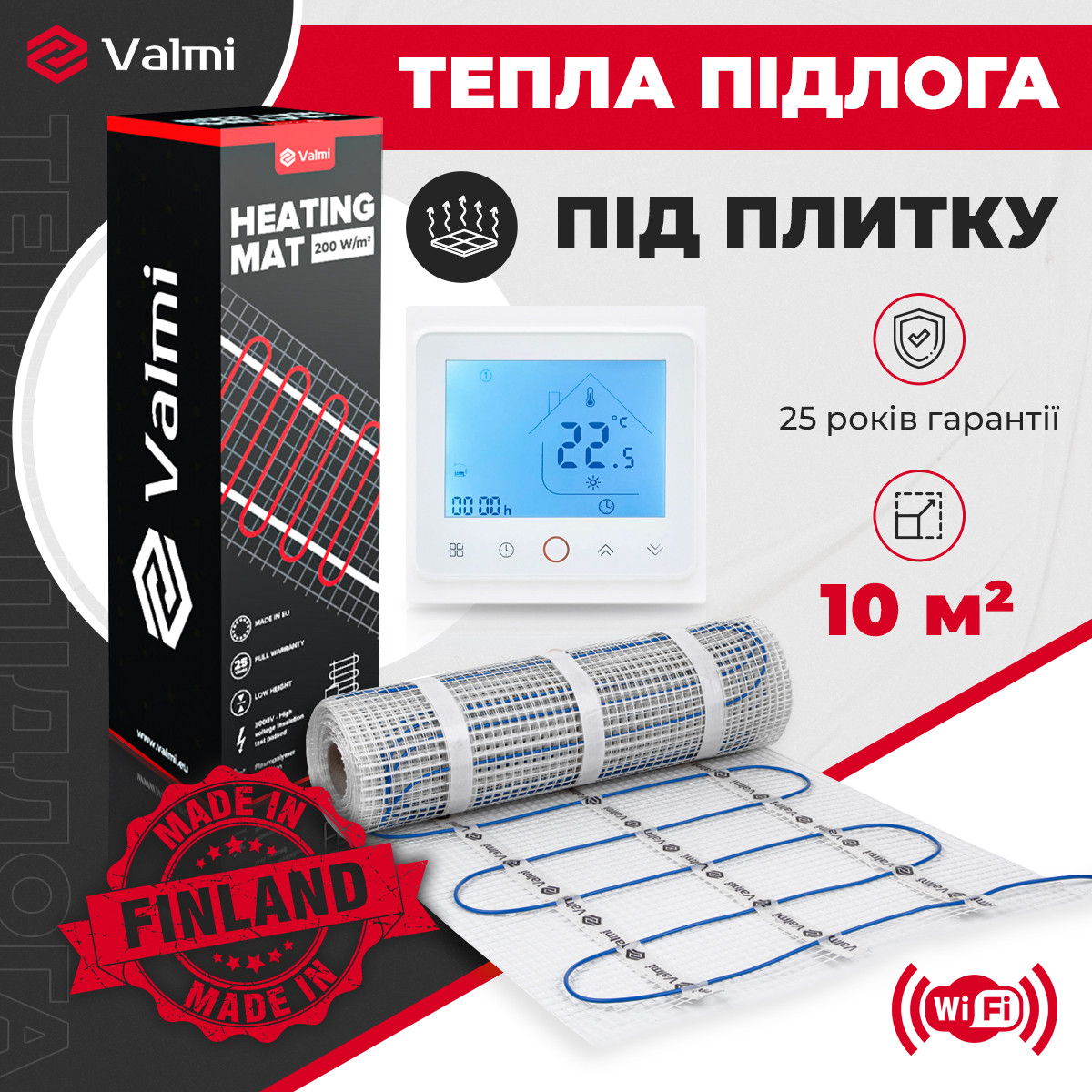 Тепла підлога Valmi Mat 10 м² /2000Ват/200Вт/м² тонкий гріючий кабельний мат з терморегулятором TWE02 Wi-Fi